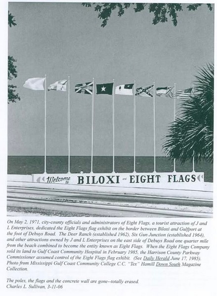 The actual name of this quirky little attraction was the "Eight Flags Deer Ranch." The Deer Ranch, as the name implies, was a deer petting zoo. According to one of the park's brochures, visitors would be "amazed and thrilled as you actually hand feed, pet and photograph tame deer from many parts of the world." If that wasn't amazing enough for you, there were drum-beating ducks, a bird vaudeville theatre, can-can girls at the Red Dog Saloon (advertised as an "authentic old saloon with air conditioning added"), the piano virtuosos of "Professor 88," and (my favorite) western gunfights at Six Gun Junction. Eight Flags was located just off of Highway 90 right on the line between Biloxi and Gulfport, and was a part of Gulf Coast tourism from 1962 to 1984. With shows every day during the summer months and on weekends for several other months of the year, the attraction was a stop during many a family vacation, and a great place for local teens to work during the summer. Many of those who worked there - included the deer poop sweepers - consider it the best job of a lifetime.