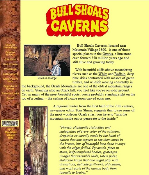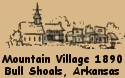 Entrance to Mountain Village 1890 and Bull Shoals Caverns -- Mountain Village 1890, an historic re-creation of an Ozark settlement, is a living tribute to the pioneers who first settled this remote part of the country. These were hardy men and women who followed the trails into our mountains from the Carolinas, Virginia, Tennessee and Georgia. The village is a Bull Shoals, Arkansas, attraction that draws families, particularly those interested in local or living history, from across the United States.