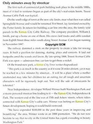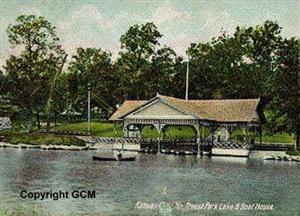 Troost Park was purchased by the city in 1902 and still contains the 3 1/2-acre lake and a Mormon marker at the south end of the lake. The marker indicates the site where Joseph Smith and 11 of his followers of the Colesville branch met and camped, in August, 1831. A log was laid for the first house and school as a foundation of Zion in Kaw township.