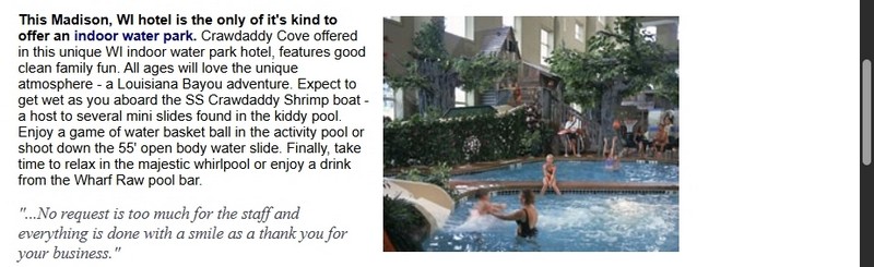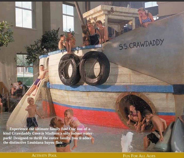 Please inquire for wristband sales Mon-Thurs! Crawdaddy Cove! Madison's only indoor waterpark! Kids can play in the shrimp boat, while you enjoy the over-sized whirlpool and the Wharf Raw pool bar. The waterpark is open daily from 9AM to 9PM. Wristbands are required for entry. Entry is limited to registered guests only Friday after 3PM, all day Saturday, 9AM-12PM Sunday and during spring break. Please inquire for wristband sales Mon-Thurs!