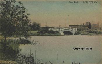Turn-of-the-twentieth century postcard image depicting a bridge in Allen Park in Augusta, Georgia. Sutherland Mills appears in the background of the image. Allen Park was one of several city parks to be opened along the Augusta Canal during the late nineteenth and early twentieth centuries. Located at the northeast corner of Fifteenth Street and May Avenue, Allen Park was frequented by the families of nearby factory and mill workers.....